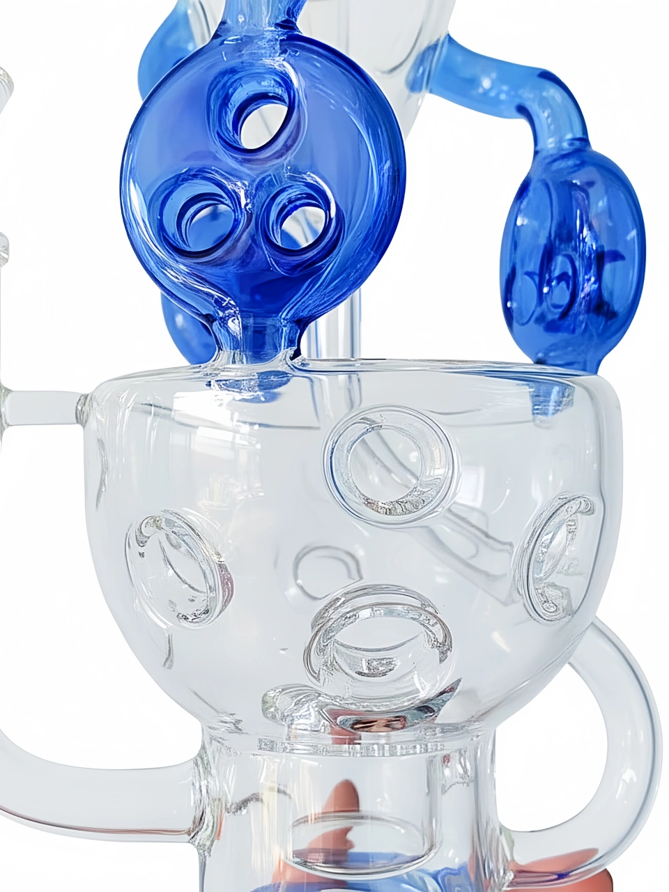 Crafted from durable borosilicate glass with vivid cobalt-blue accents, this piece is as much an art display as it is a performance powerhouse.