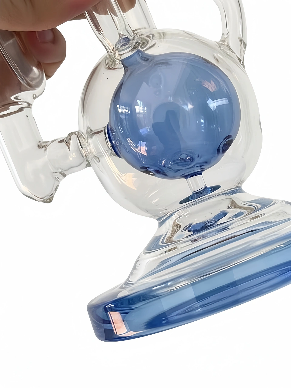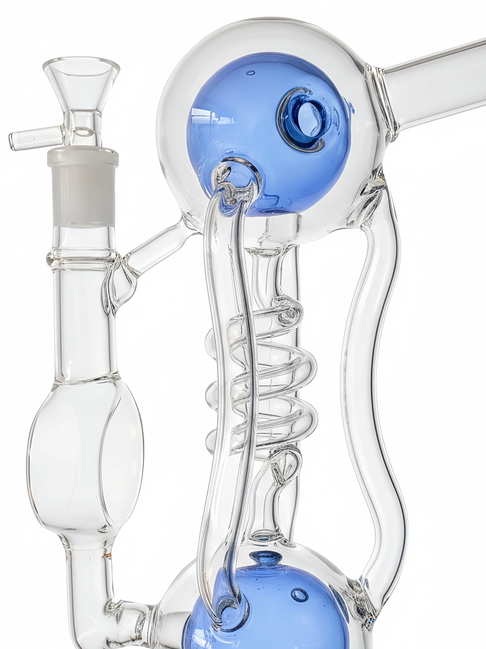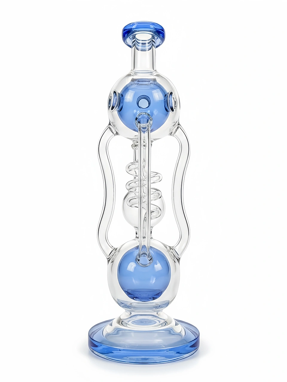 Meet your new desk buddy: the Blue Spiral Double-Ball Recycler Bong! With two vibrant sapphire-blue balls at its core and a swirling, see-through design, every puff feels like a mini science experiment. Watch smoke and water dance together in a mesmerizing spiral—it’s a visual treat you can almost get lost in.