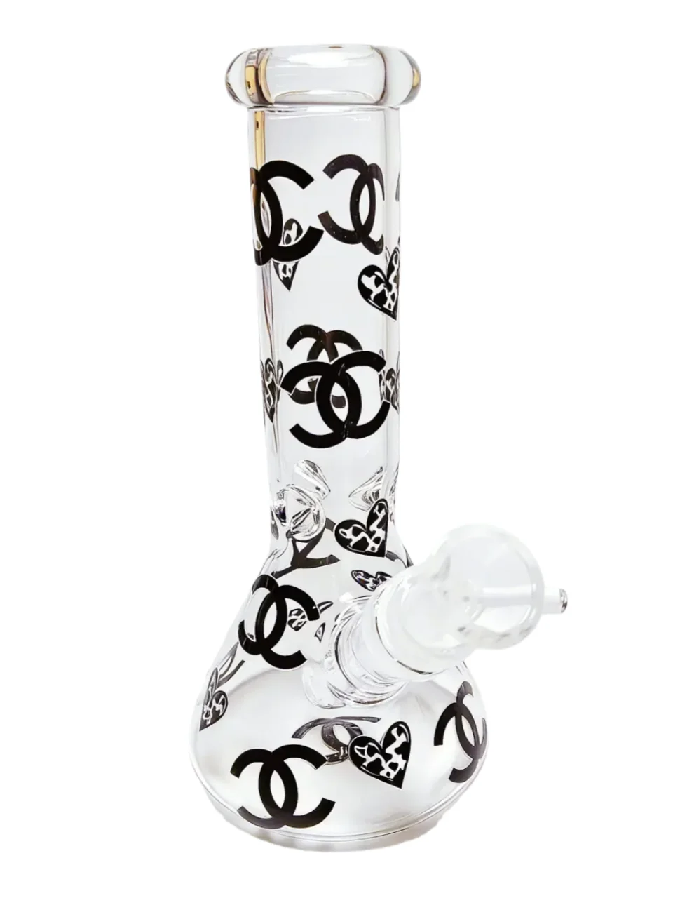 Meet your fashionable chill buddy! This 8-inch mini bong features Chanel-inspired logos and playful leopard heart accents on clear glass. Carry a touch of runway glamour wherever you go!