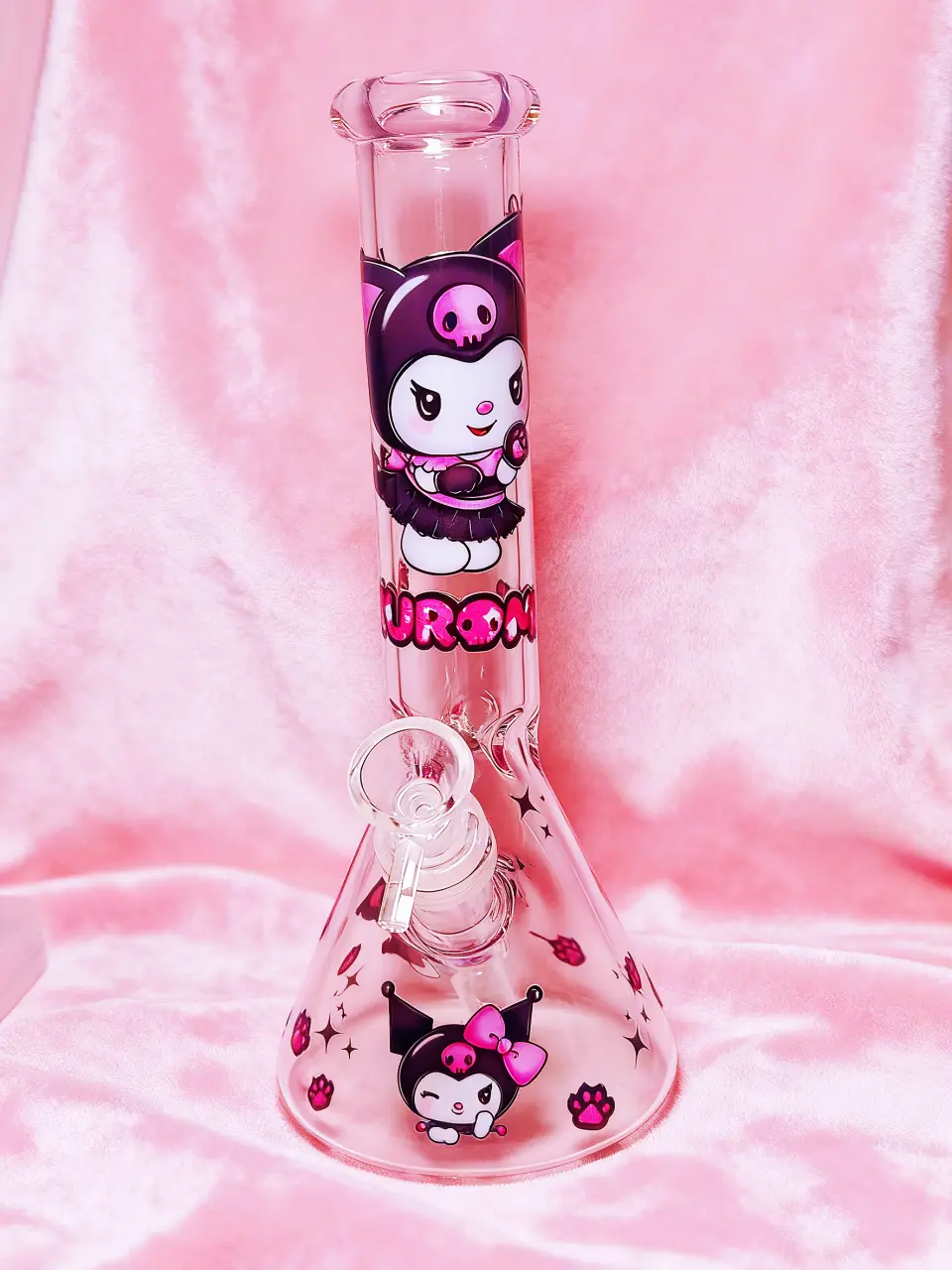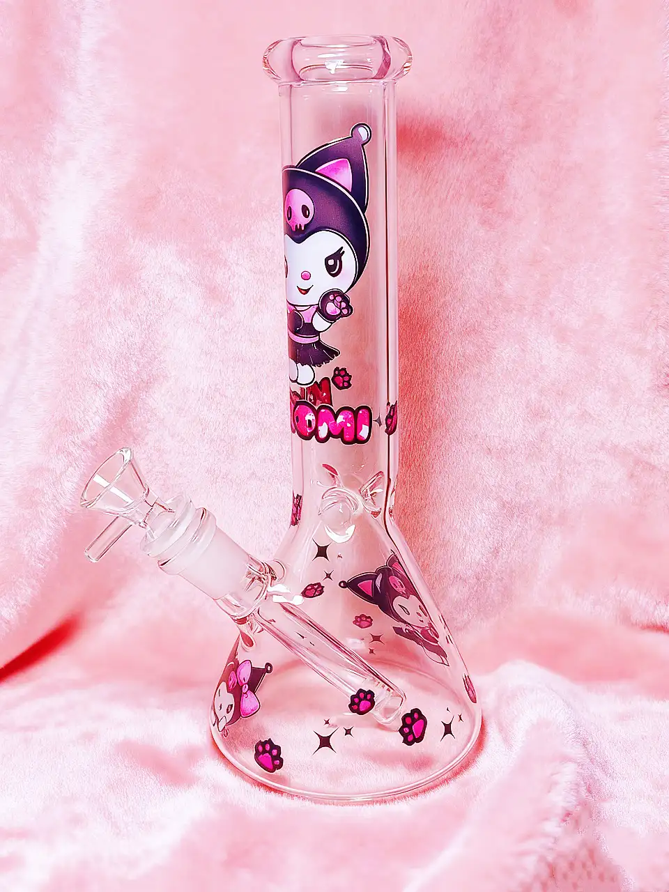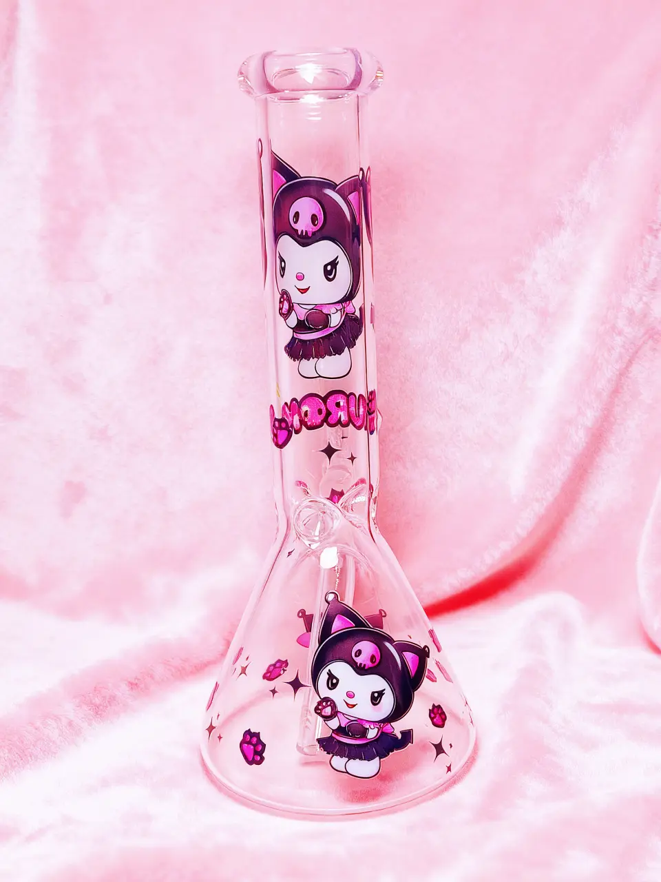 Bring some mischievous charm to your collection with this adorable Kuromi beaker bong! Standing at 10 inches tall, it features a sturdy beaker base made of thick, high-quality borosilicate glass for durability and stability.