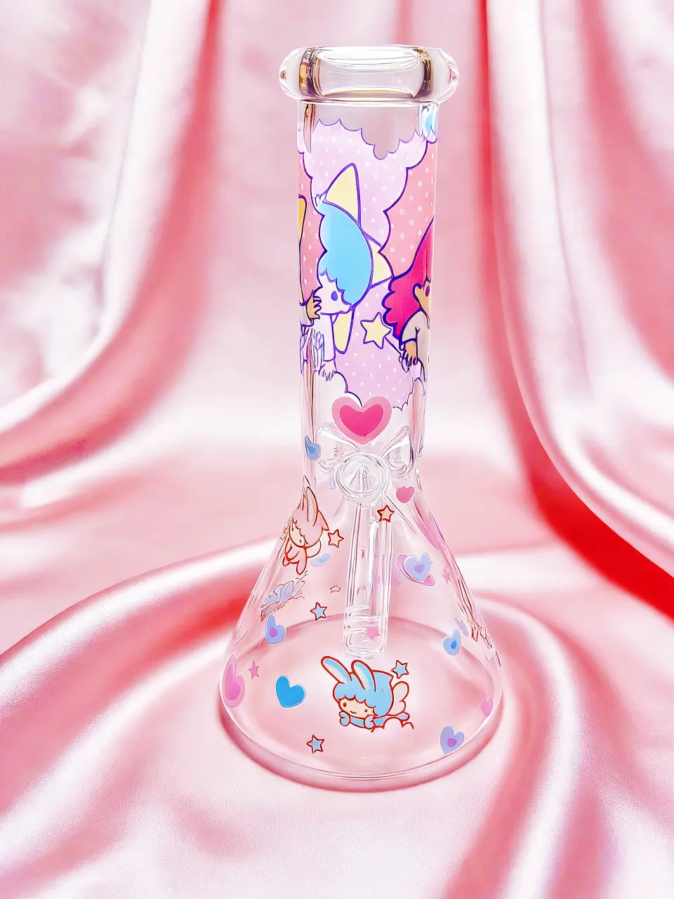 Step into a soft pink galaxy. This 8-inch Little Twin Stars glass bong features Kiki and Lala floating through stars, hearts, and dreamy pastel clouds. Their iconic pink and blue colors pop beautifully against clear glass, giving off pure fairy-tale energy at first glance.