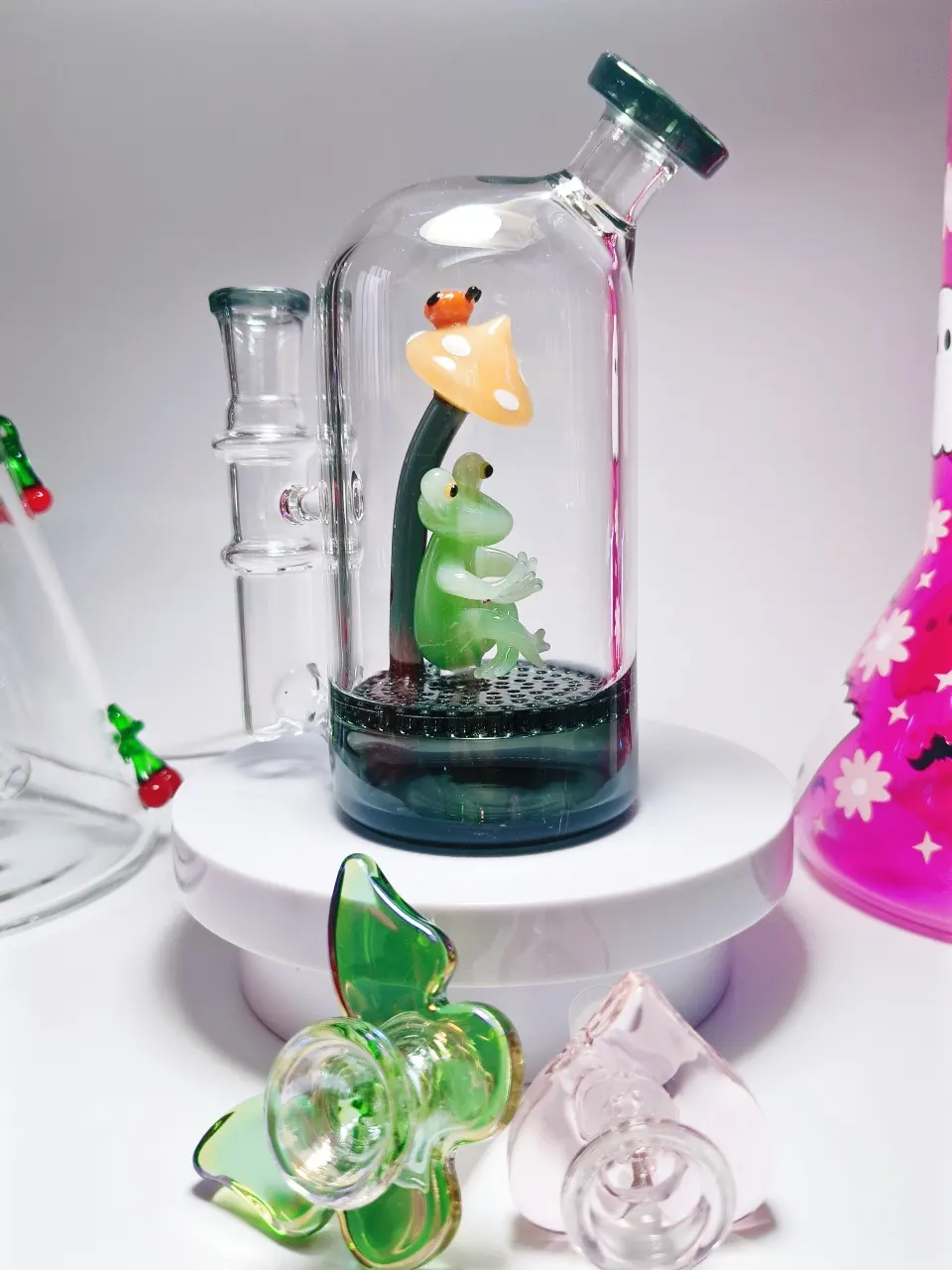 Hop into your next sesh with this adorable frog-themed bong, featuring a sweet little frog chilling under a red toadstool, joined by a tiny ladybug for good luck. The playful color accents in blue, red, green, and yellow bring this charming scene to life, making it a standout piece for any collection.