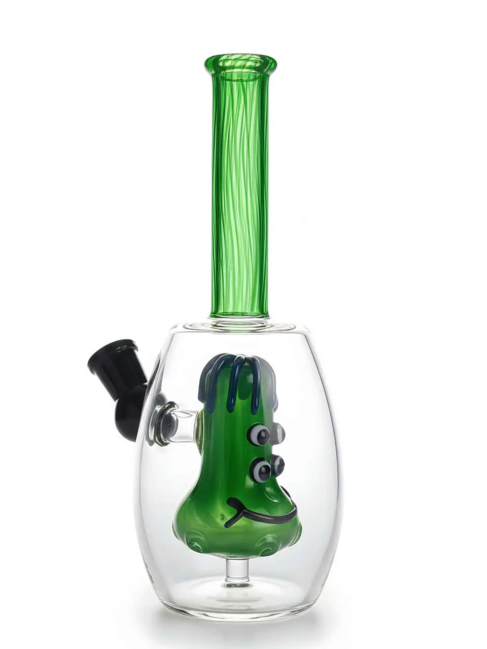 This little bong is pure fun from top to bottom. Its round egg-shaped base is made from clear, sturdy glass, giving you a full view of the magic inside. Right in the center, you’ll spot a green cartoon face — big eyes, wide grin, and a whole lot of attitude.