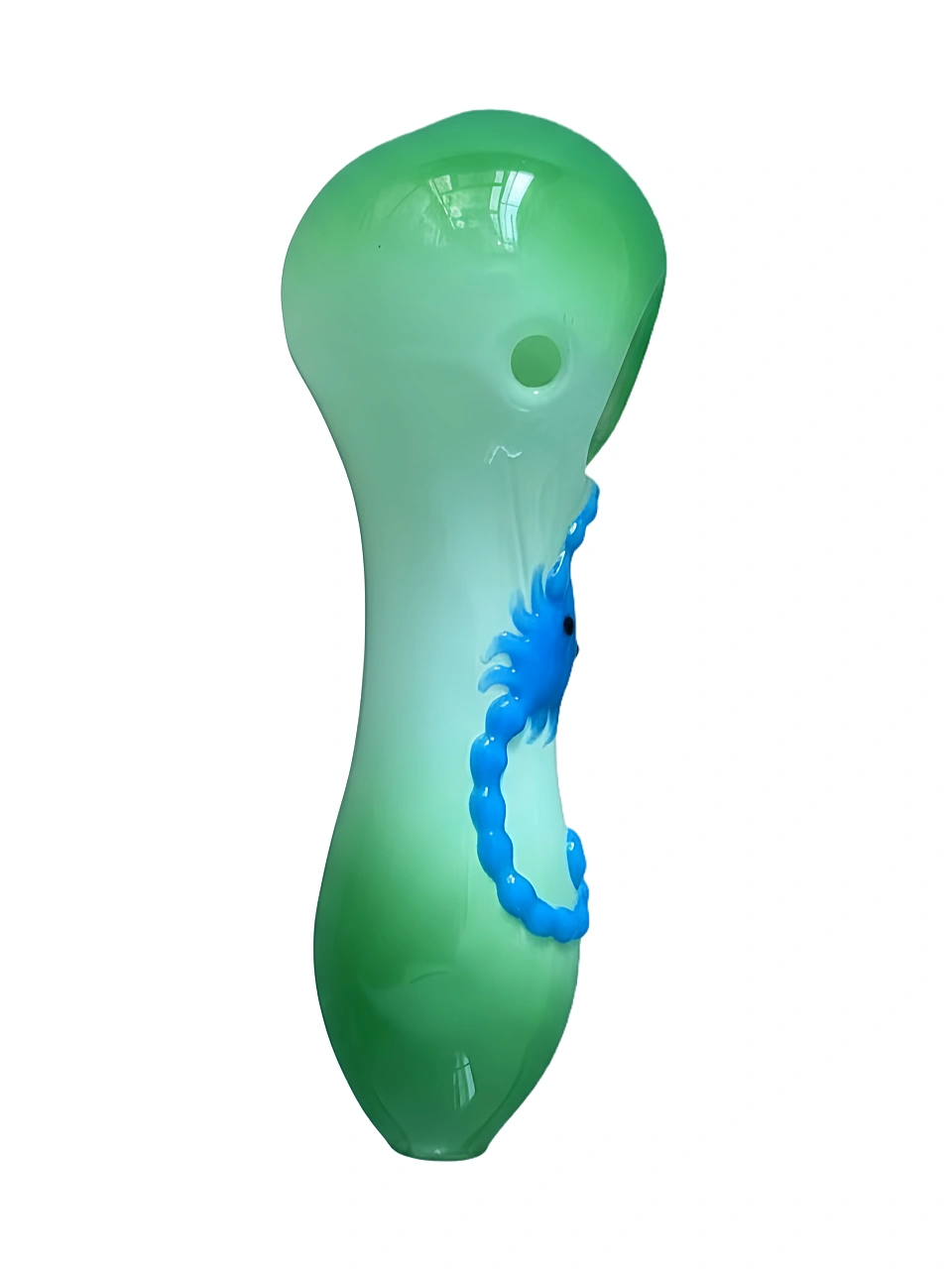 Add a sting of style to your sessions with this 4.3-inch Scorpion Glow Spoon Pipe. Crafted from high-quality borosilicate glass, it features a smooth green-to-white gradient body accented by a bold, raised blue scorpion. The scorpion glows in the dark, creating a soft, mysterious shine that stands out in any setting.