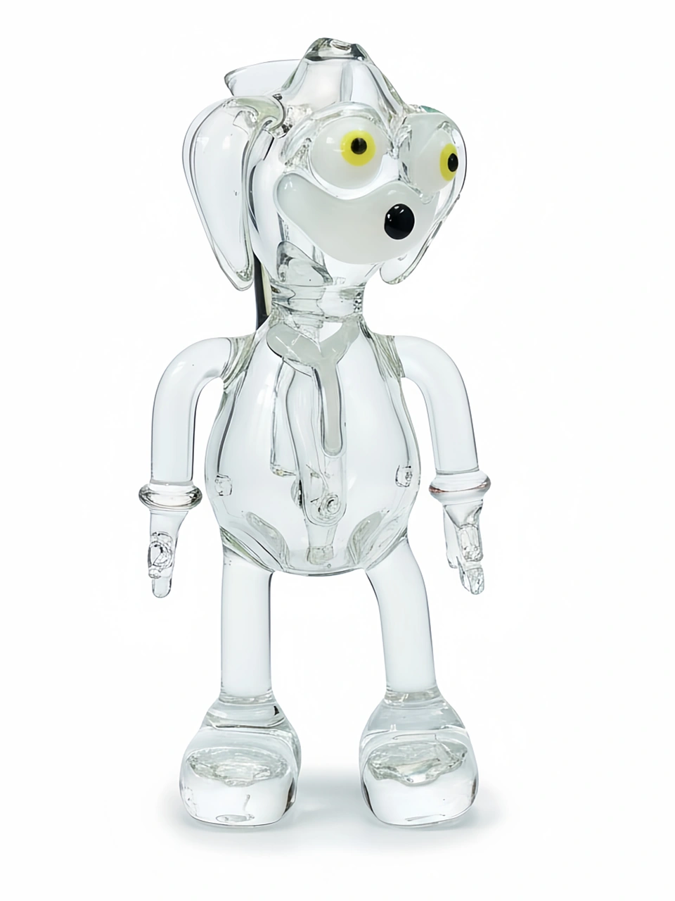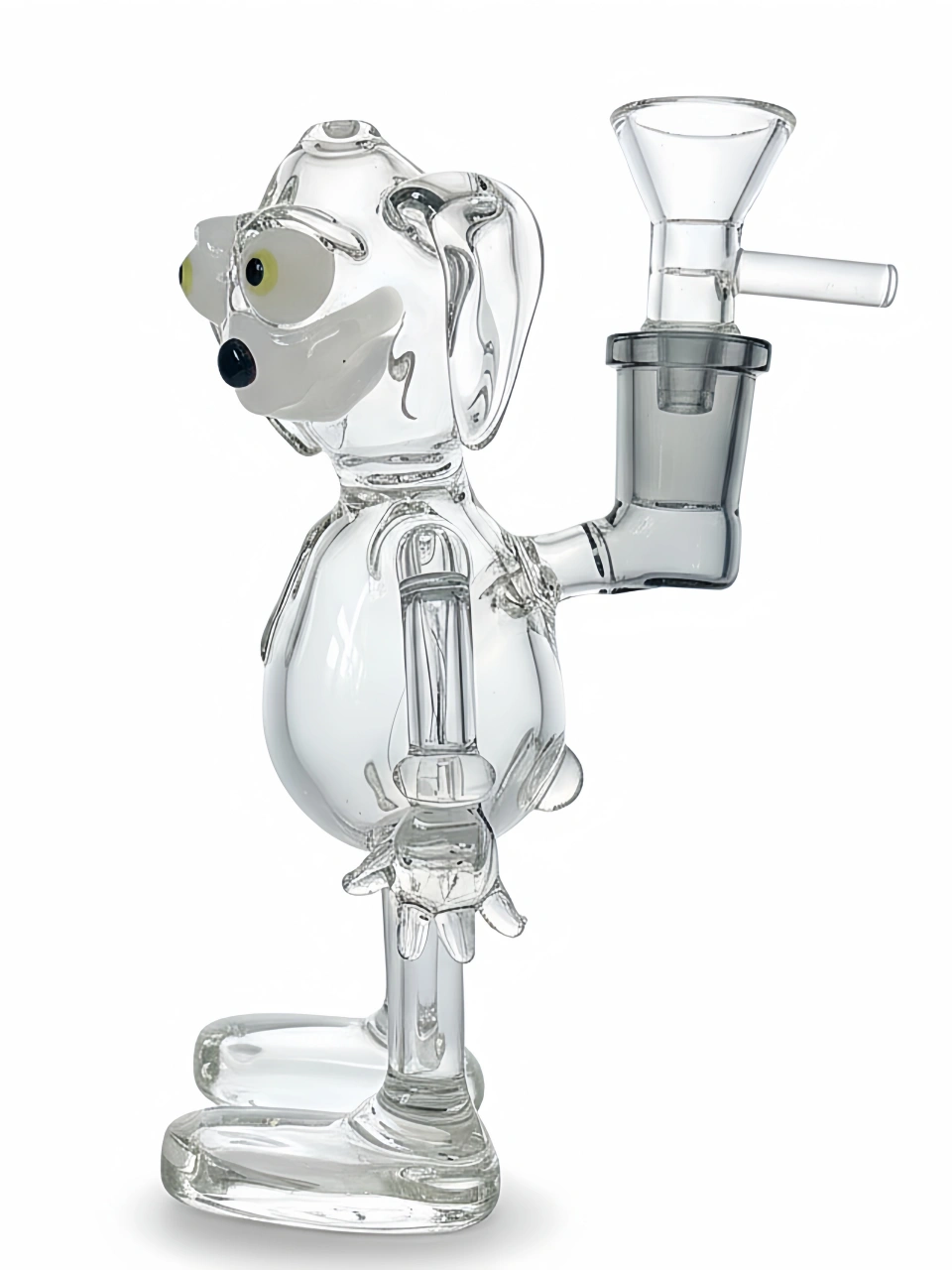 This 5.5-inch (14cm) puppy glass pipe is a delightful display of craftsmanship and charm. Meticulously handcrafted from clear borosilicate glass, it features bright yellow-accented eyes, a black nose, perky ears, and a wagging tail, capturing the playful spirit of a lovable pup.