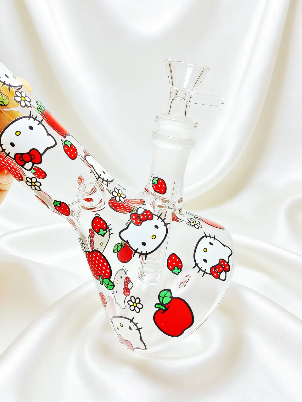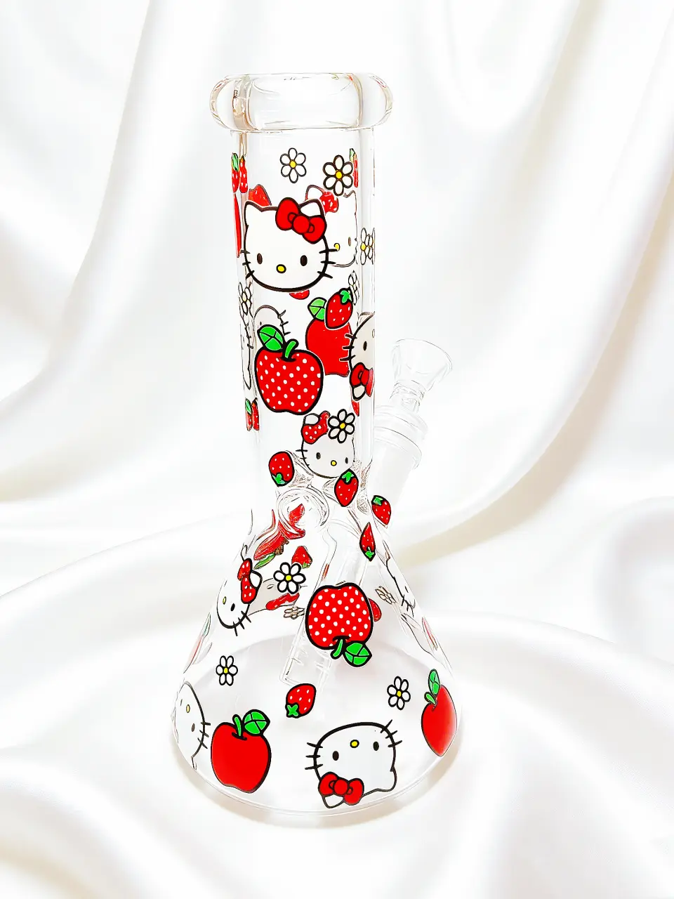 This 8-inch Hello Kitty glass bong features a bright apple and strawberry theme that feels sweet, playful, and instantly eye-catching. The clear body is decorated with bold red-and-white graphics, juicy fruit details, and Hello Kitty’s iconic bow, creating a look that’s cute, nostalgic, and full of happy summer energy.