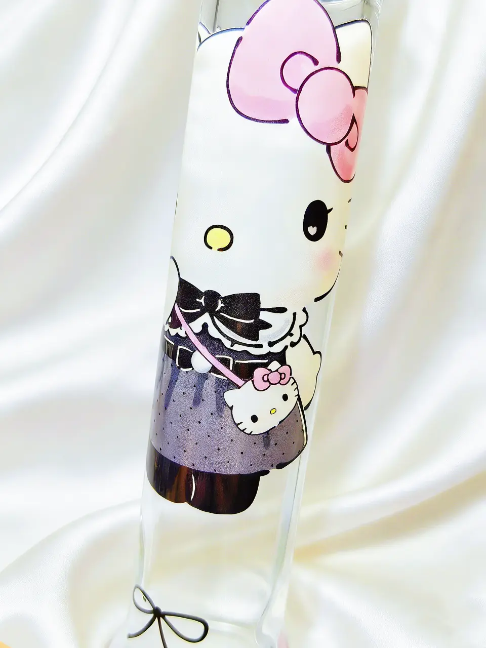 This bong is soft, elegant, and quietly stunning. Hello Kitty appears as a sweet Lolita girl, dressed in black lace with delicate polka dots and a blush pink bow. Small lace ribbons, petals, and hearts float across the glass, creating a refined Lolita-inspired design that feels romantic without being too loud. It’s pretty, polished, and full of classic charm.