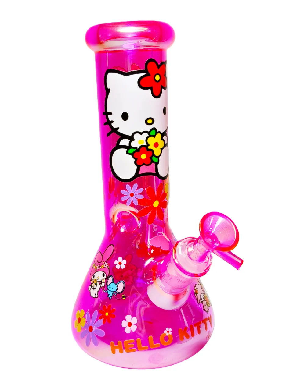 Every detail is playful — from the vibrant floral decals to Hello Kitty and My Melody printed right on the body. The hot pink color even extends to the bowl area and frosted joint, giving the whole piece a matching, full-pink aesthetic that’s impossible to ignore.