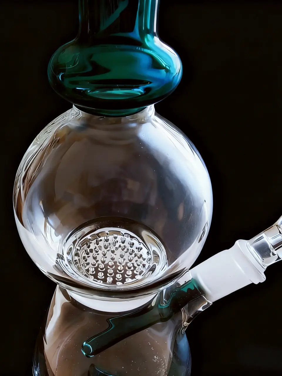 Crafted from high-borosilicate glass, it’s tough, sleek, and crystal-clear. The wide cone-shaped base keeps it stable, while the rounded water chamber sits on top. Inside, the honeycomb perc works its magic — filtering and cooling each hit for extra smooth draws.