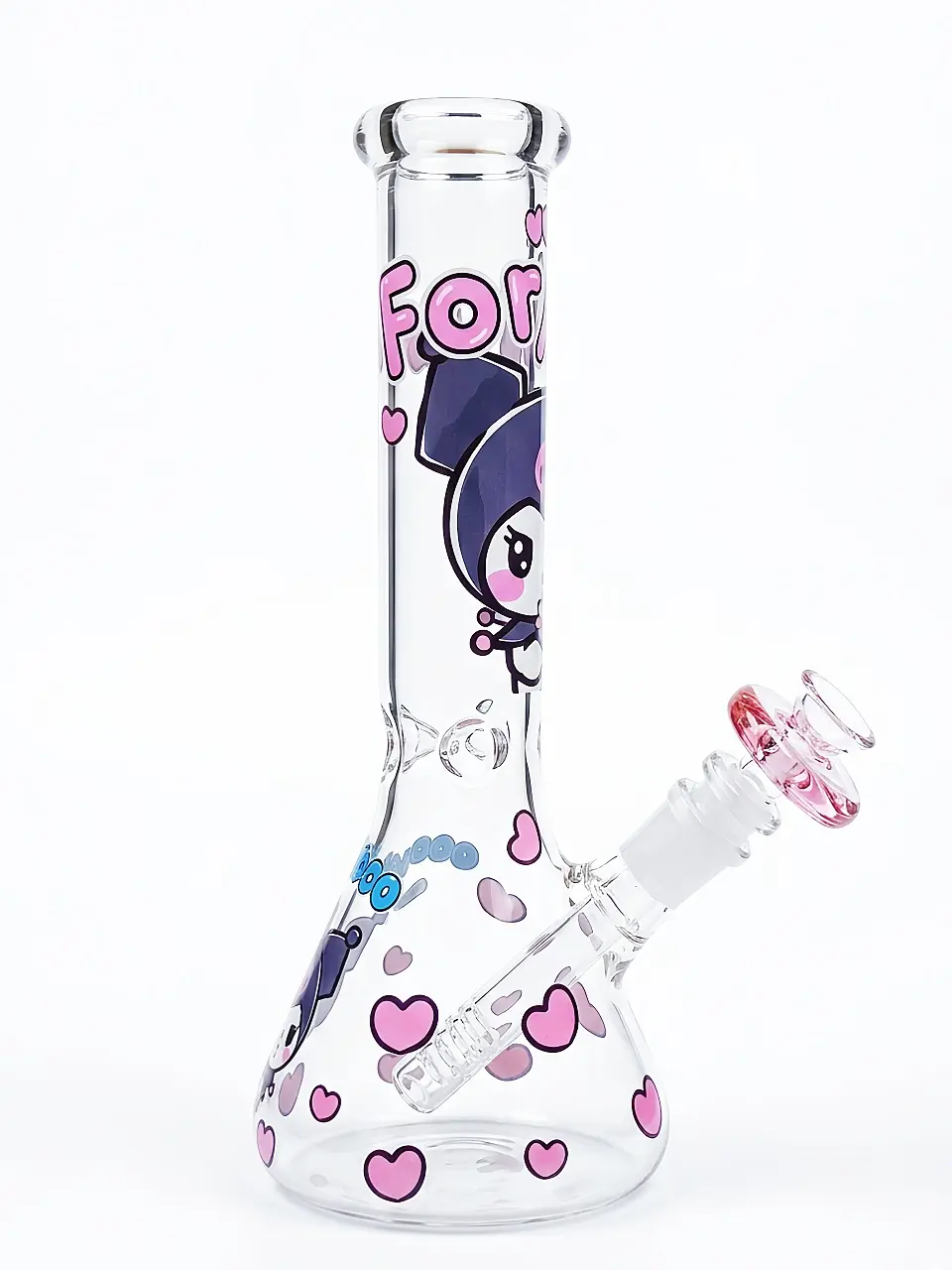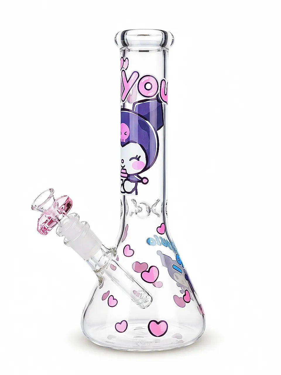 Meet the ultimate sweet & edgy vibe! This 10″ beaker bong stars Kuromi, Sanrio’s playful rebel, with her signature purple hood and “for you” text on the bottle—making it an extra-special gift. The neck and base are decorated with pink skulls and whimsical heart motifs, turning every glance into a mini adventure.
