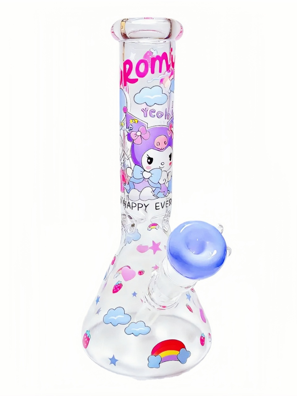 Get ready for major cuteness overload. This 10-inch Kuromi glass bong shows Kuromi in her rare soft-girl era, dressed with bows and floral details. Surrounded by strawberries, clouds, and rainbows, the pastel purple and pink tones feel like a cozy strawberry dream you never want to wake up from.