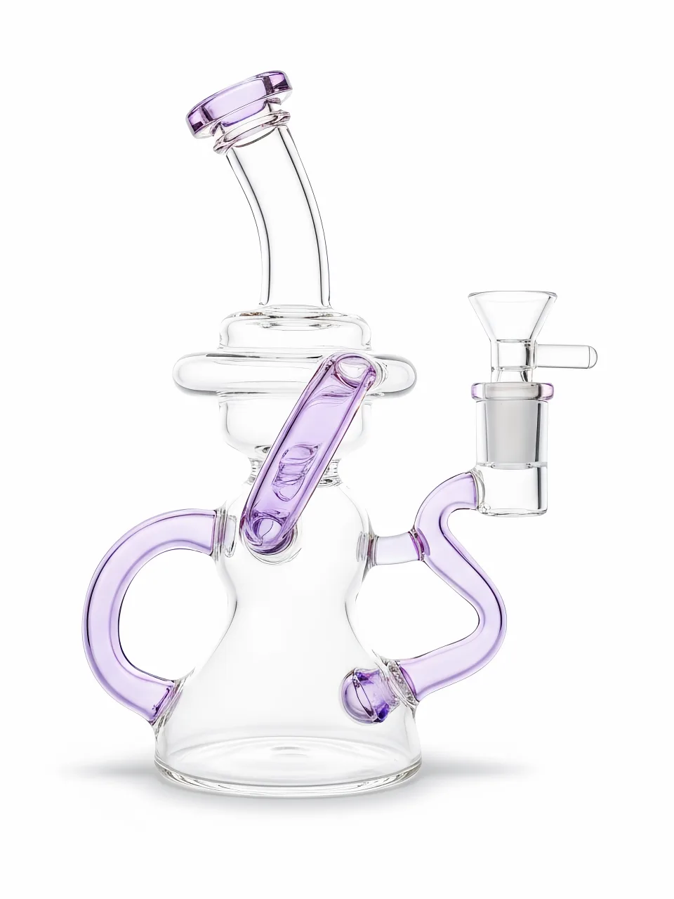 This bong is pure motion. Clear glass meets soft lavender accents, creating a clean look that feels both mechanical and graceful. Two purple recycle tubes run along the body, turning every pull into a mini water show. The dual recycler design keeps bubbles dancing nonstop, making it just as fun to watch as it is to use.