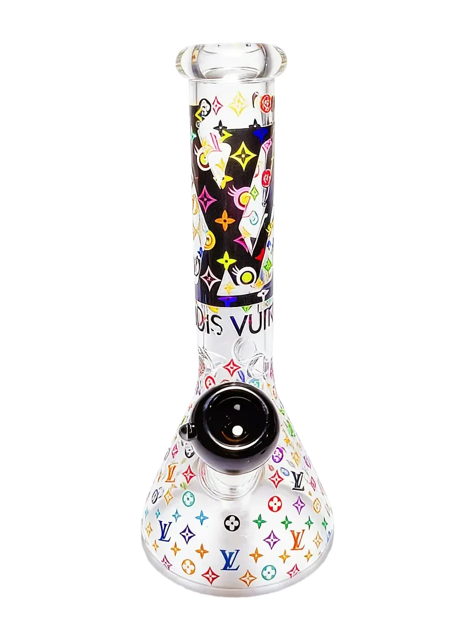 Meet your chic new companion! This 10-inch bong dazzles with LV-inspired monogram patterns and colorful symbols, giving every puff a luxe, playful vibe. It’s like holding a tiny piece of runway glamour in your hands.