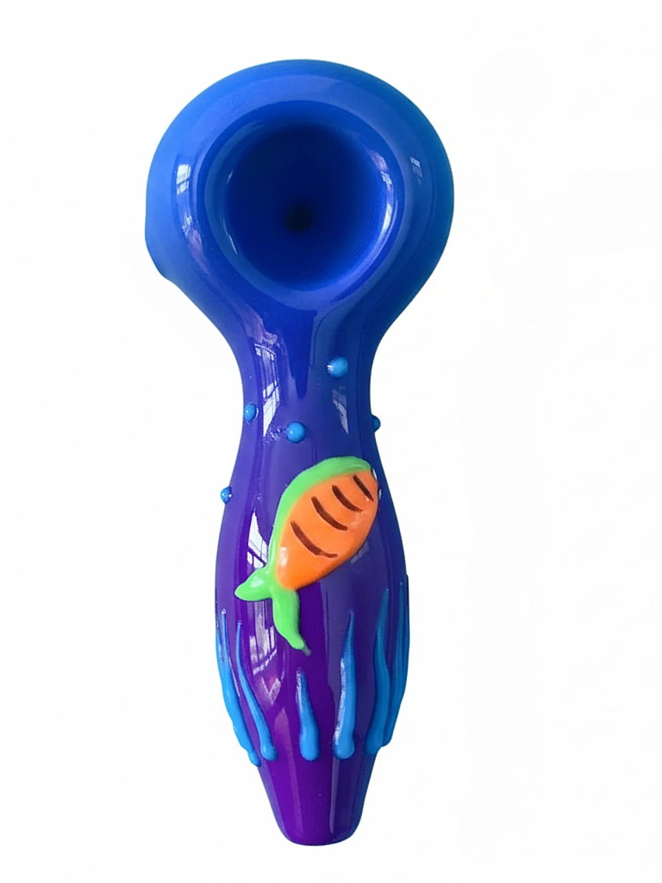 Inspired by the deep sea’s mysterious beauty, it features a smooth gradient from rich indigo to royal purple, echoing the shifting light underwater. Hand-painted details—like cheerful blue bubbles and a whimsical orange-and-green fish—make each pipe one of a kind. The overall look is calming, playful, and full of wonder.