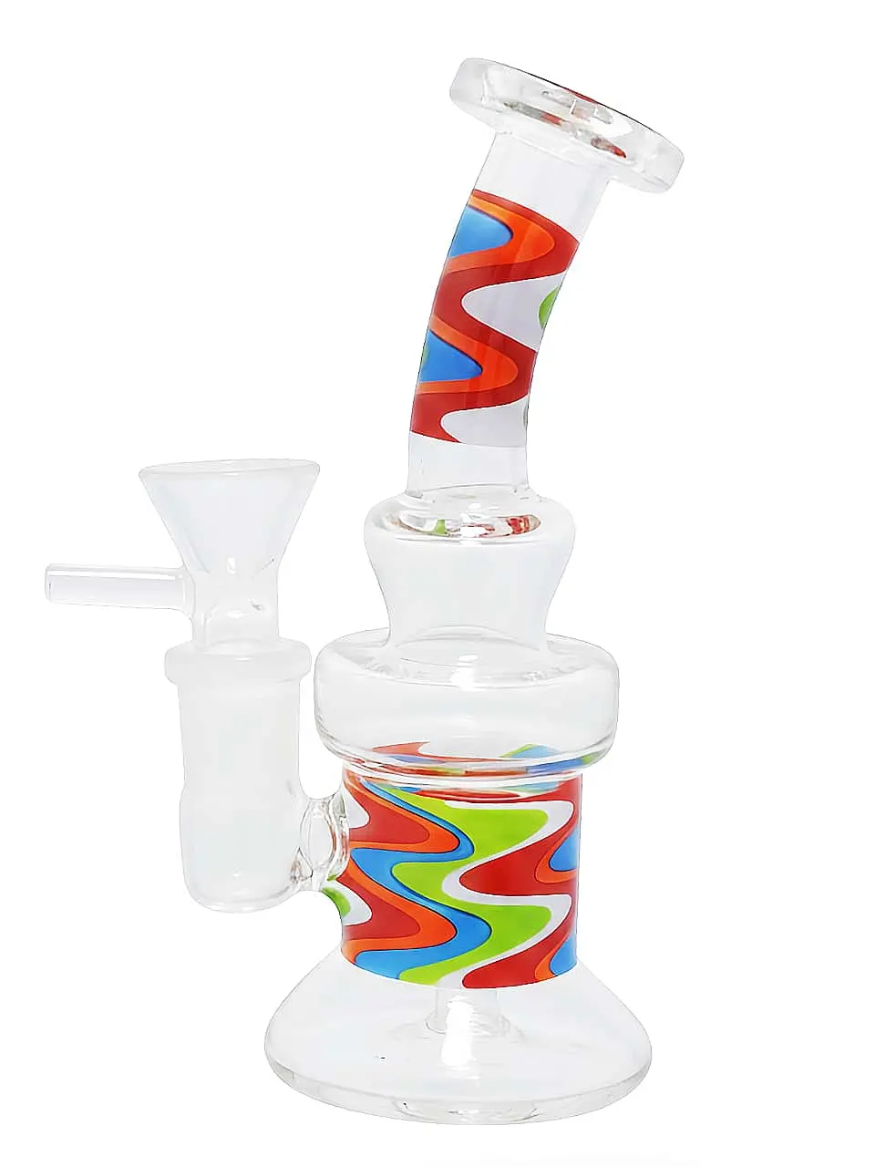 This little bubbler is pure visual rhythm. The first thing you’ll notice is the psychedelic wave artwork—bright orange, blue, and green lines flowing across clear glass like music you can see. The stacked shapes add depth and movement, so even sitting still, it feels alive. It’s bold, playful, and definitely a vibe piece.