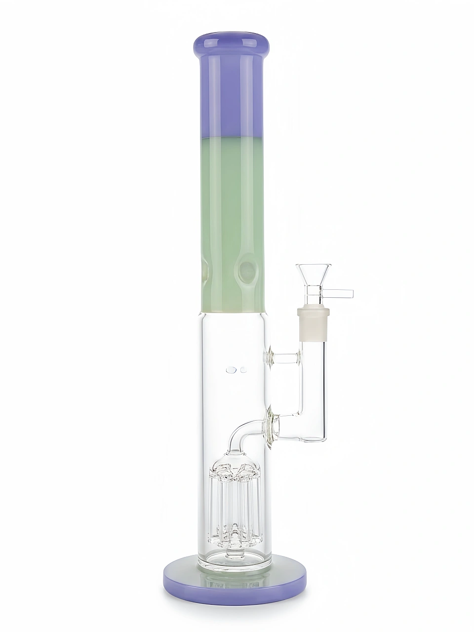 This 14-inch glass bong stands out with its sleek straight-tube design and a vibrant mix of purple and jade green hues. The color combination gives it a fresh, modern look that’s both playful and sophisticated, making it a striking addition to any collection.