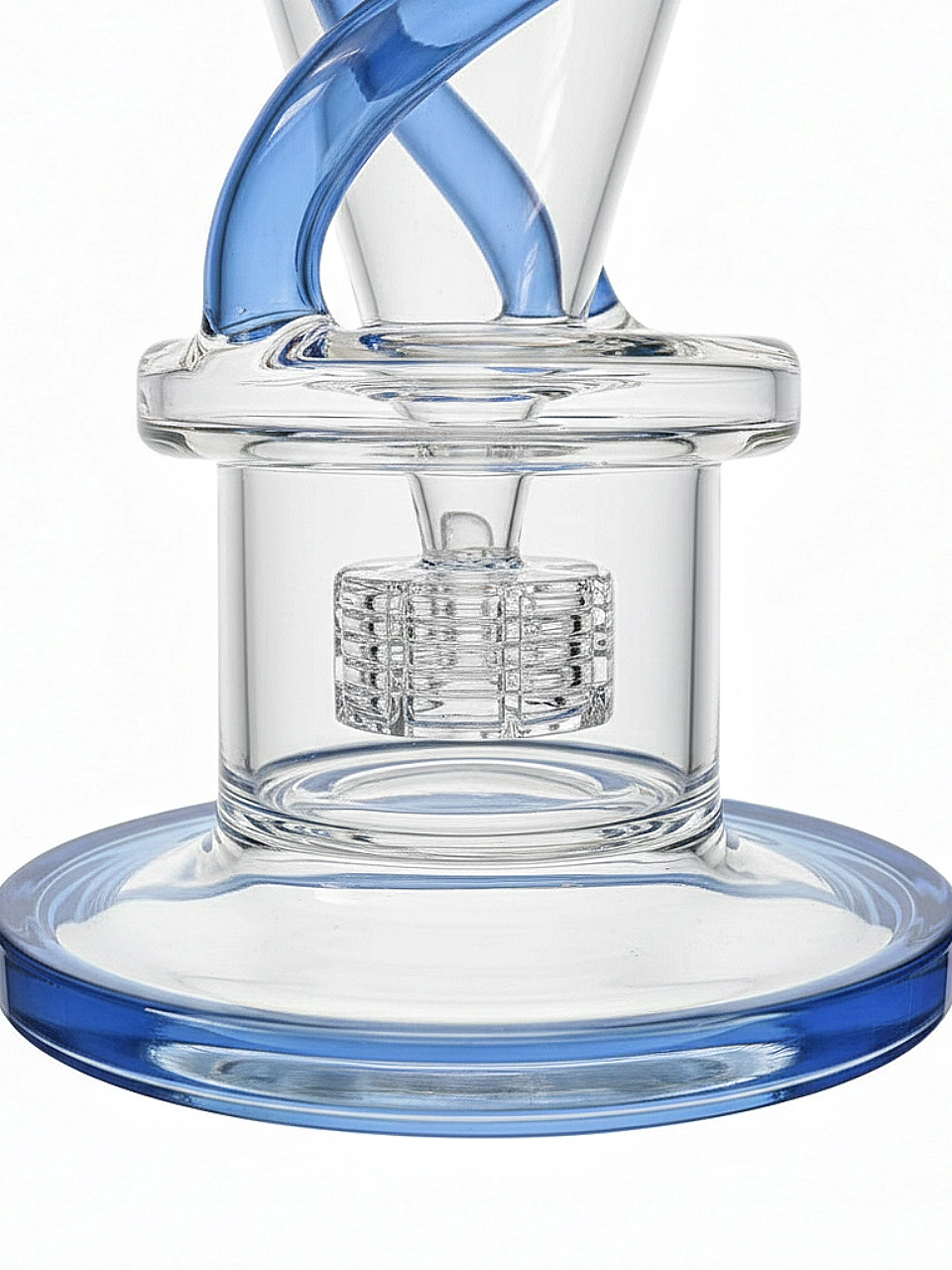 The bold blue glass accents on the recycler arms and rimmed mouthpiece give this bong a modern edge, while the wide 4.25″ base ensures excellent stability during use.