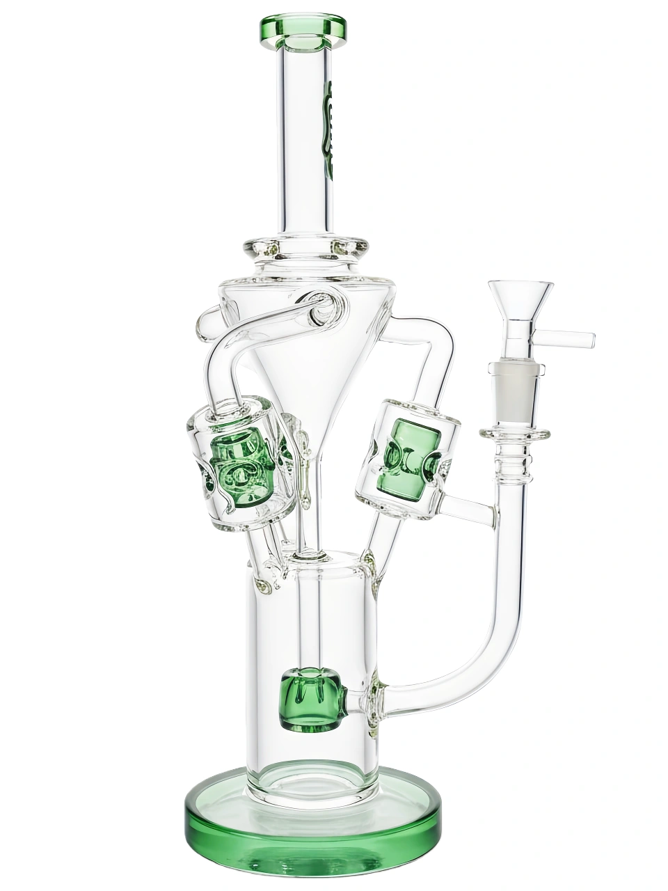 This glass bong stands out with its elegant style and detailed craftsmanship. The clear borosilicate body is accented with green touches on the base and joint, adding a subtle pop of color that complements its intricate internal structure.