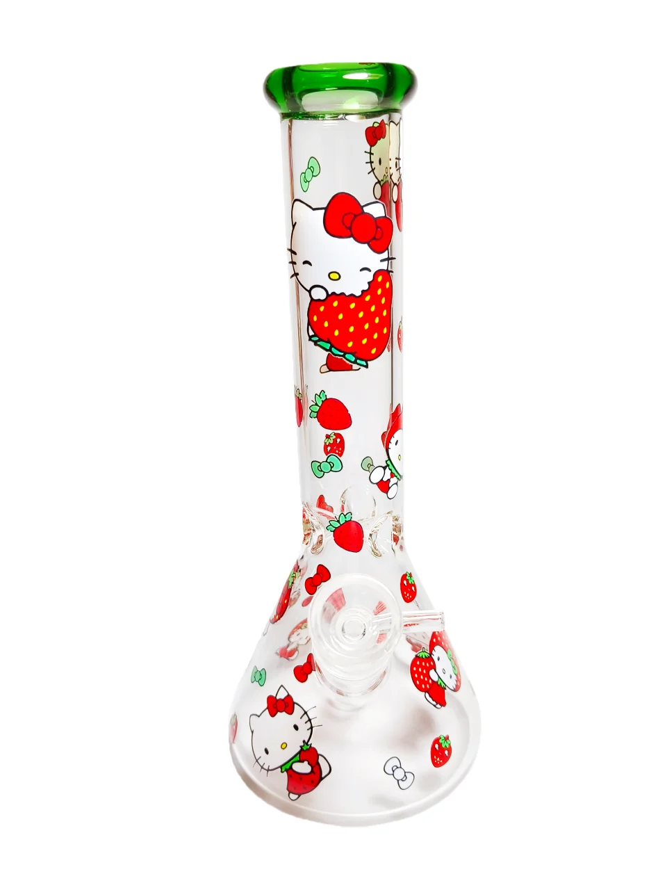 The clear glass body is covered in vibrant strawberry patterns and adorable Hello Kitty scenes. She rocks her signature red bow and a cute strawberry dress, making every angle super sweet. The green accents on the mouthpiece add a fresh, natural pop that pairs perfectly with the red strawberries.