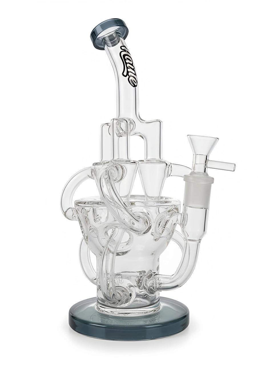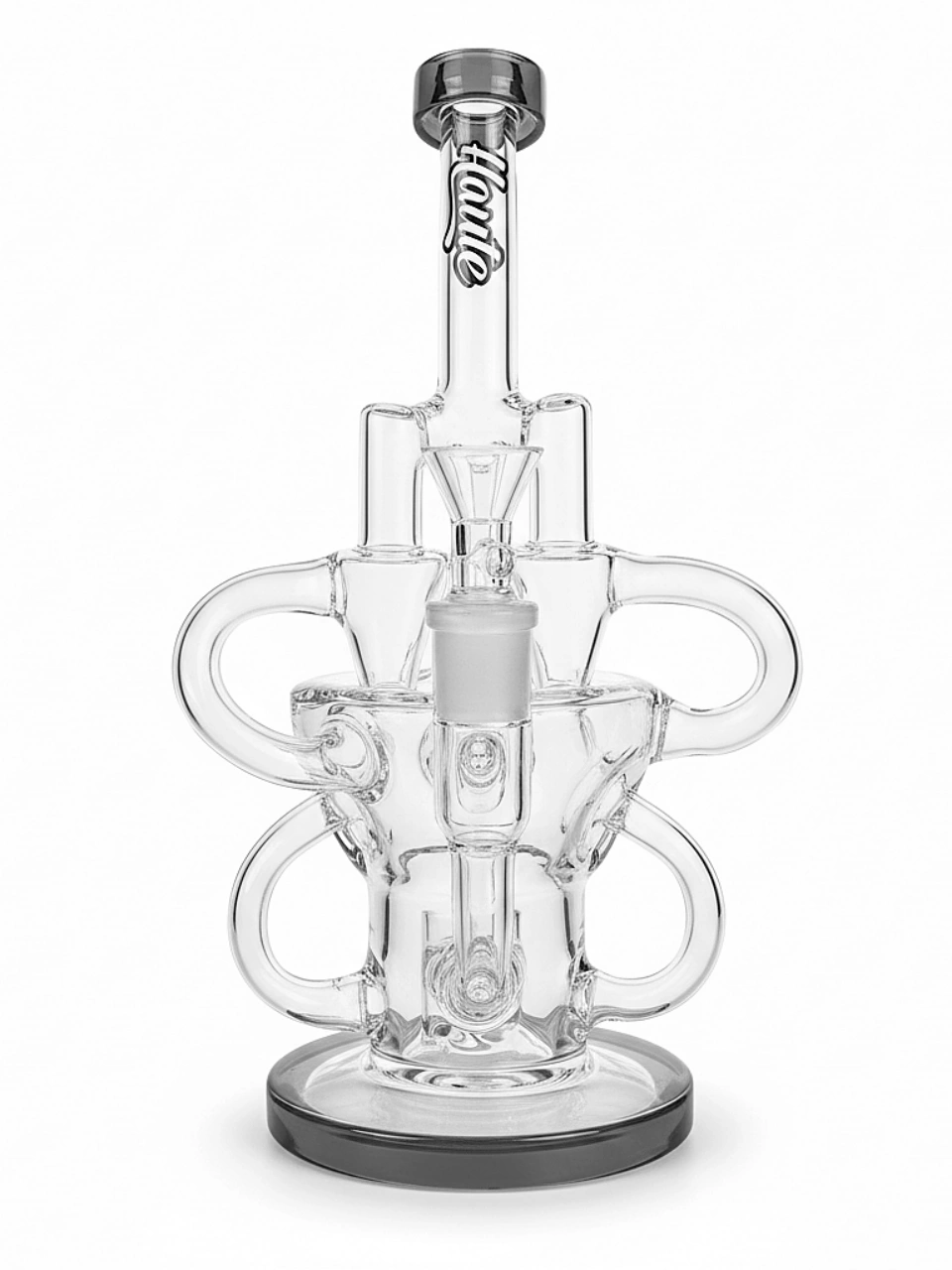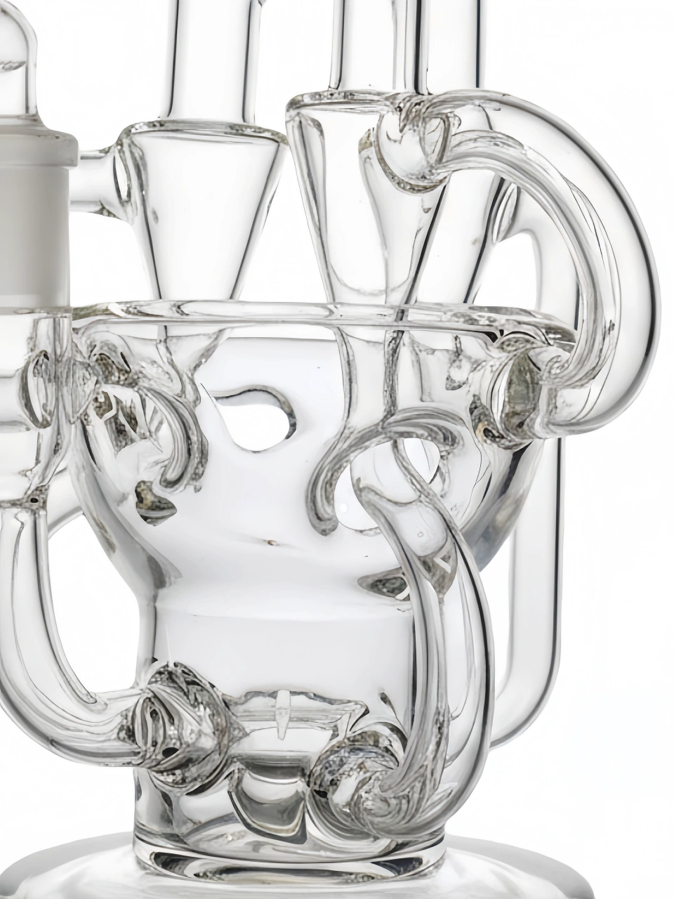 Smoke enters the bong through a fixed downstem and is immediately filtered through a five-slit disc percolator. As you continue to pull, the main chamber is filled with smoke. It is then that the recycler goes to work, with water and smoke traveling through all of the tubes in the bong, continuously filtering and cooling the vapor until it eventually travels up through the bent neck mouthpiece.