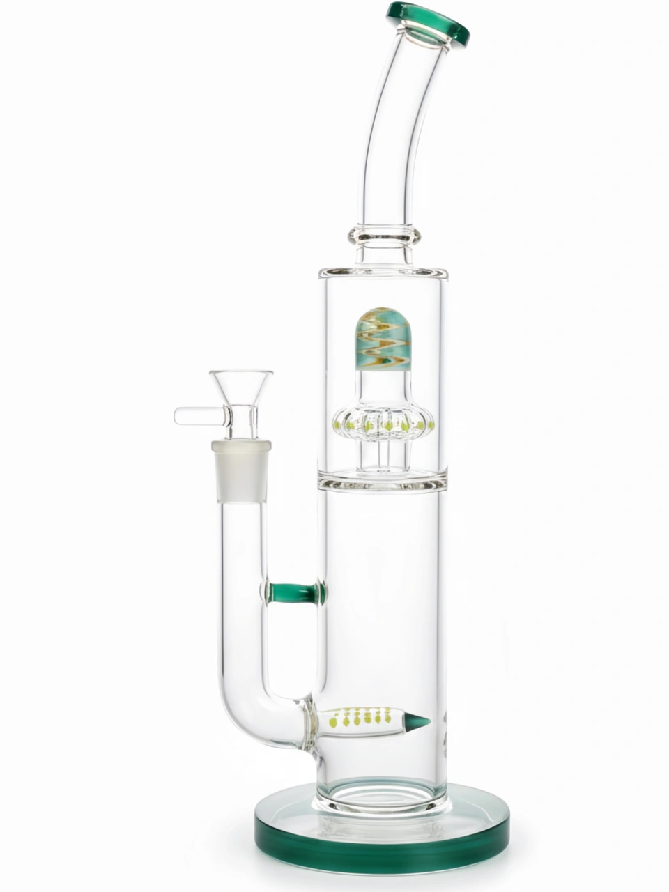 Made from crystal-clear glass with sleek teal details on the base and mouthpiece, it’s got a sharp, modern vibe. Inside, an inline perc and disc showerhead UFO perc team up to deliver ultra-smooth filtration and a cool visual twist as the smoke spins through. The result? Pure performance with a little showmanship.