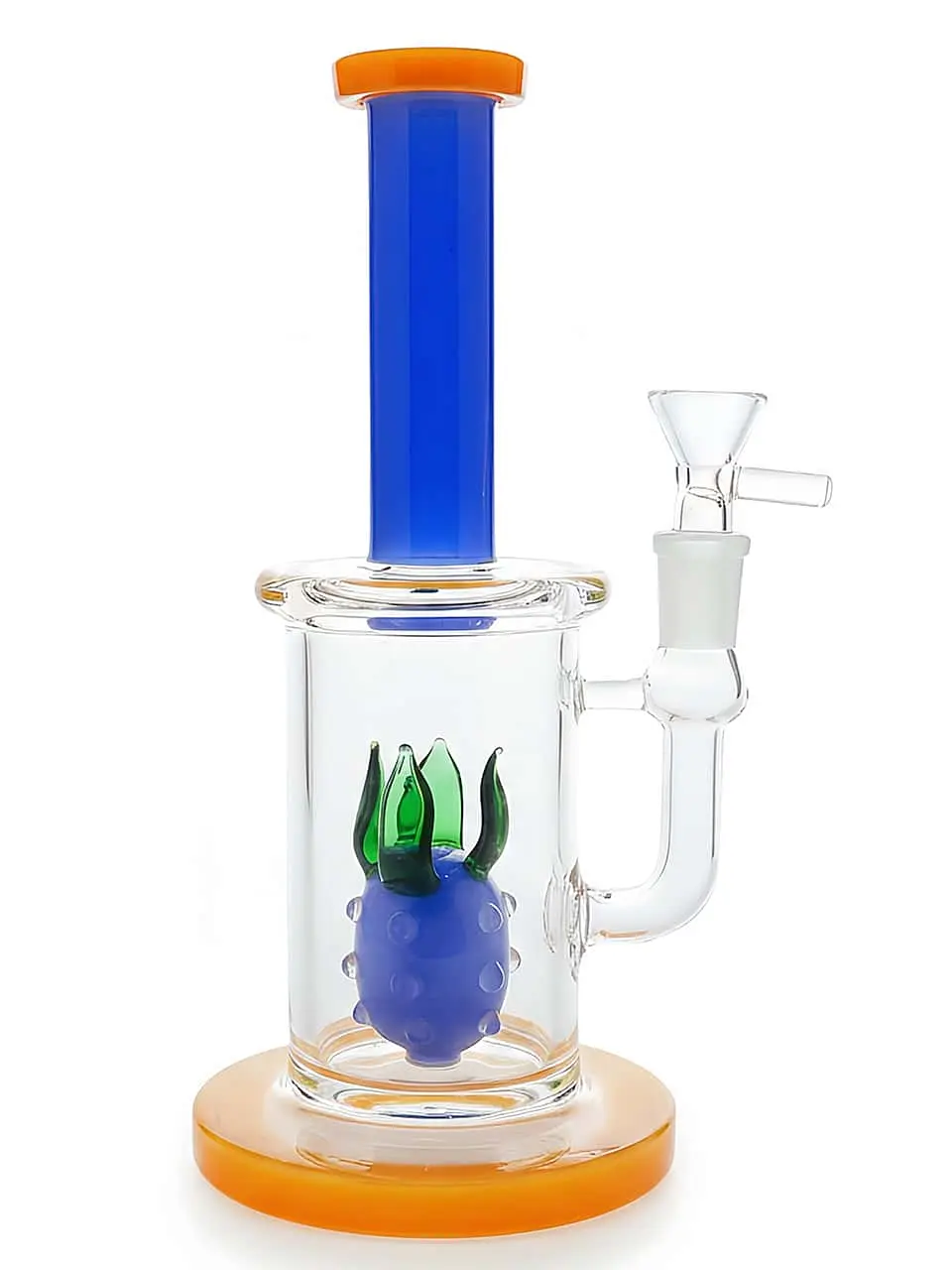 Standing 9 inches tall, this bong uses a straight-tube design that keeps things simple and effective. Smoke travels straight down into the pineapple perc, then bursts out through tiny holes all around it. You can literally watch bubbles form and dance around the fruit. The blue neck mirrors the pineapple tones, creating a clean, cohesive look.