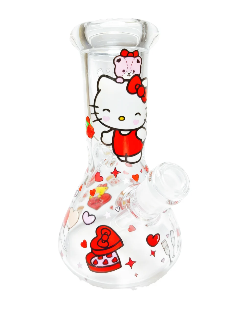 The clear glass body features Hello Kitty in her signature red dress and bow, waving cheerfully with a tiny pink bear on her head. The glass is sprinkled with hearts, chocolate boxes, heart-shaped balloons, and champagne cups — all adding a festive, Valentine’s Day charm.